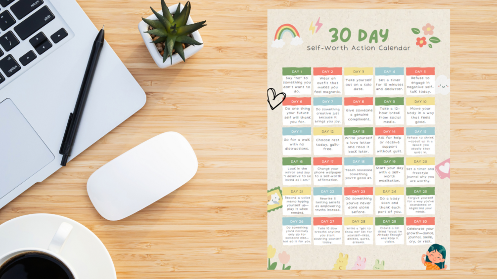 A clean, aesthetic 30-day self-worth calendar PDF with one self-worth nourishing action per day.